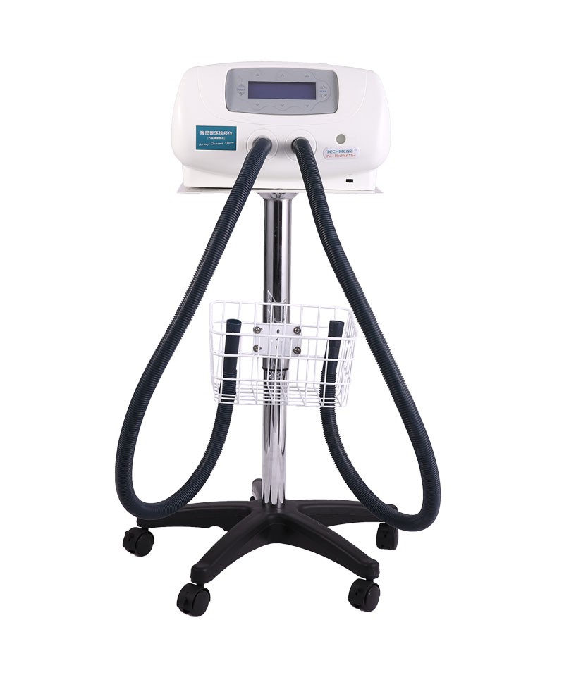 背心式排痰機作用原理: 通過模擬正常生理咳嗽的原理,將患者所穿專用充氣背心用導氣軟管連接到高速脈沖泵上,并快速地充氣和放氣,使患者胸壁發(fā)生有規(guī)律的舒張運動,患者氣道和肺部發(fā)生自主的震顫氣流和定向引流力,促使呼吸道粘液及各個肺葉深部代謝物松弛,液化、脫落;并在定向引流力的作用下將已液化脫落的代謝物按照選擇的方向(如細支氣管→支氣管→氣管)排出體外。